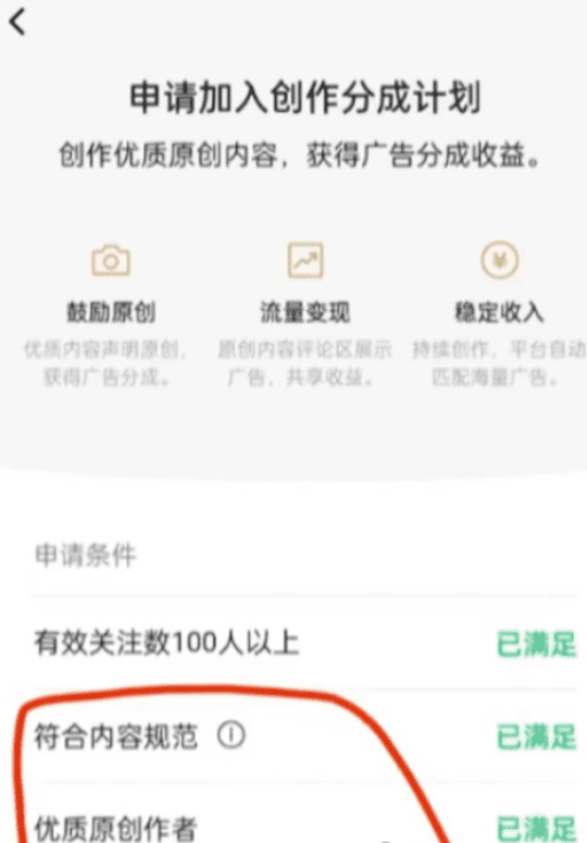 想要靠这个项目赚钱,核心抓手就是视频号「创作分成计划」,满足三个简单条件就能申请:有效关注数 100 人以上、符合平台内容规范、成为优质原创作者。