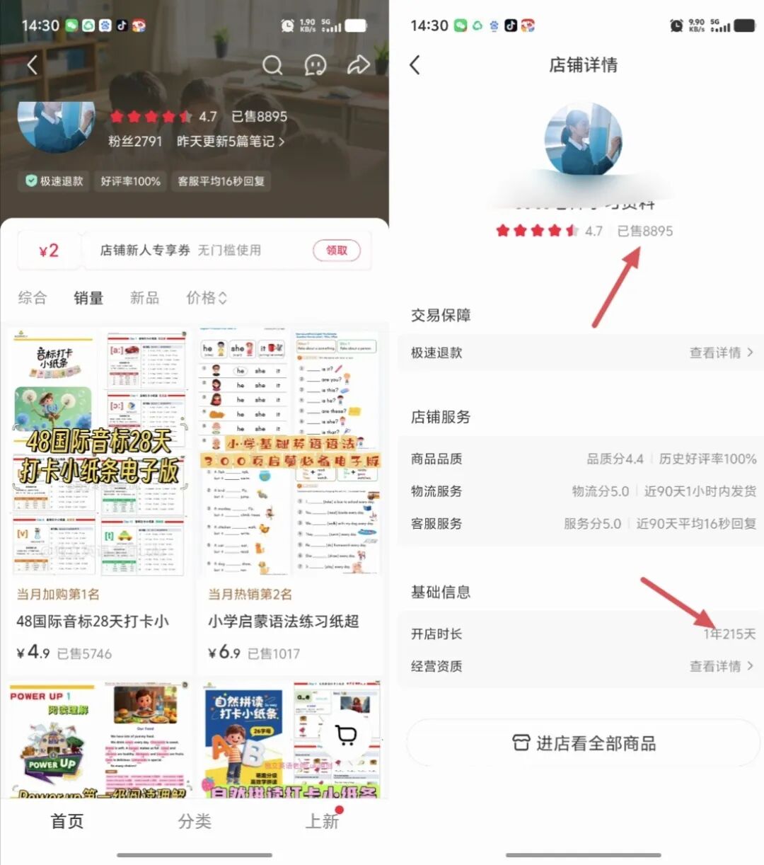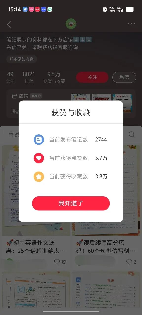 但有意思的是,两个账号卖的是同类型产品,笔记风格也几乎一模一样,都是实拍英语资料图。可现在这个账号只卖了8895单,只是上面提到的博主的零头而已。