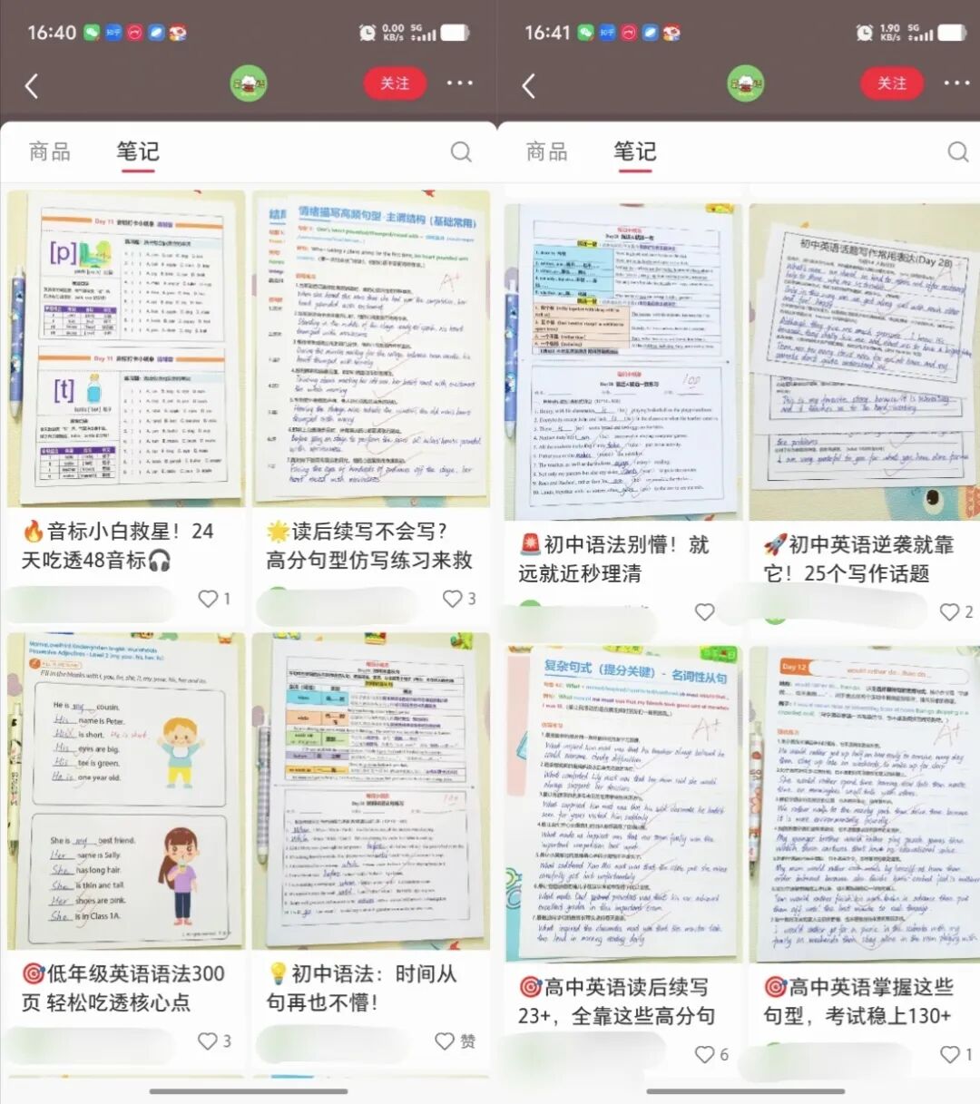 这个账号虽然发了2744篇笔记,但其中2000多篇都是围绕两个爆品——48个国际音标小纸条和初中英语语法每日练习小纸条。