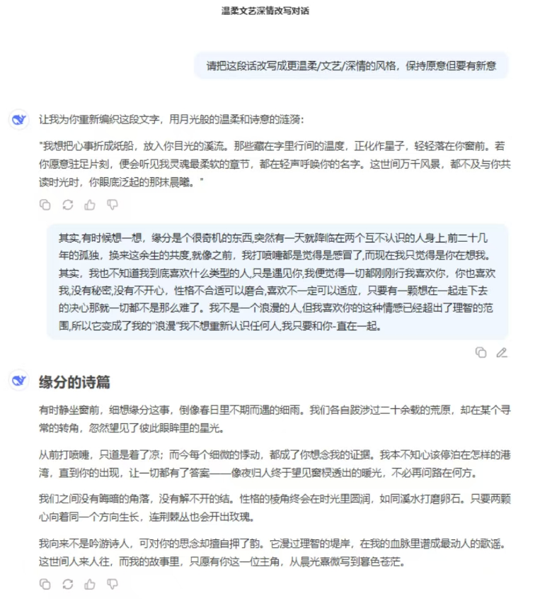 像 deepseek 或者豆包 AI 都是不错的选择。把你扒下来的爆款文案丢给 AI,输入提示词,比如“帮我把这段话改成更温柔的风格,保留原意但换种表达方式”,或者“改成文艺一点的句子,适合手写”。