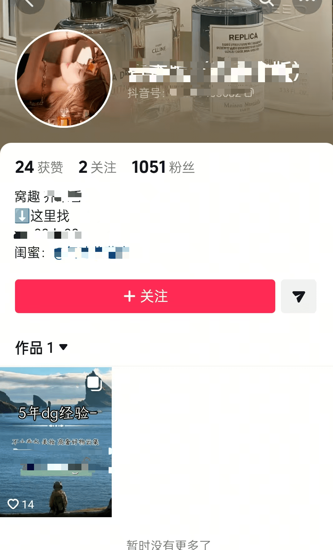 带的货都是一些平台上几块钱的廉价小样香水,不挣钱,他真正的大头在私域,可以看他的个人简介那里,@了自己的小号。