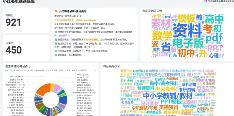 最后说下使用方式,选品库所有商品都收录在飞书多维表格里,直接申请链接就能访问。截止1月19日,已经收录921件商品、覆盖450家店铺,涵盖中小学教辅、考公考研资料、PPT模板等多个分类,热门类目还单独做了视图和销量排行榜,对应赛道的朋友能快速找到目标品。