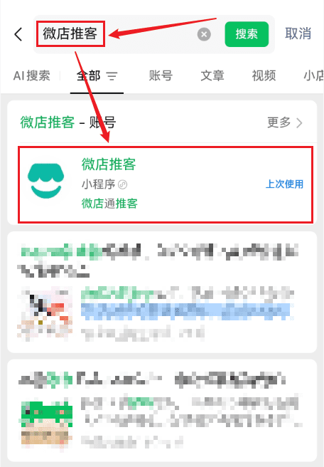 打开微信,点击右上角放大镜,搜索“微店推客”,如下图。
