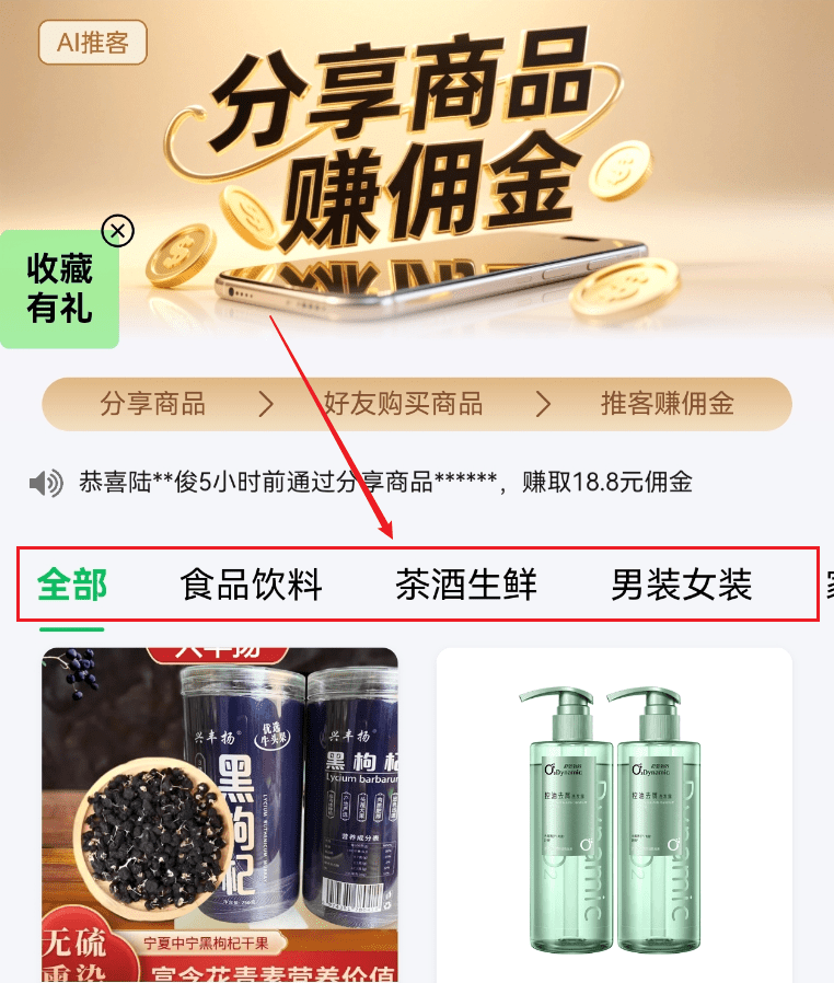 商品种类也很多,食品饮料、男装女装、电子数码等都有,平台已经做好了分类。你觉得哪个商品好卖,你就把哪个商品分享到你朋友圈。