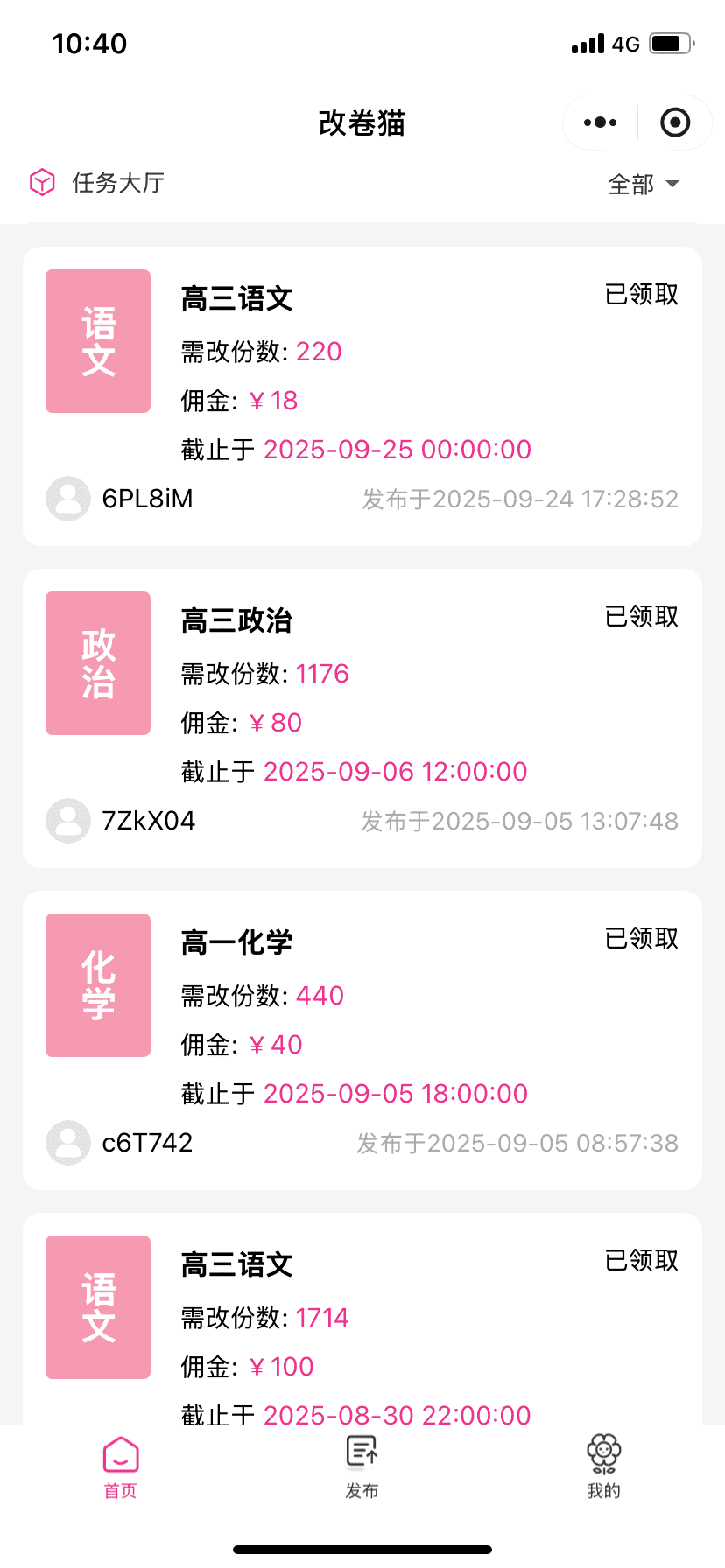 这个是一个改卷平台,服务学生的,你可以在里面当改手,或者是发布改试卷的需求,有很多科目,语文,数学,物理等等你可以选一个你擅长的科目去做就行