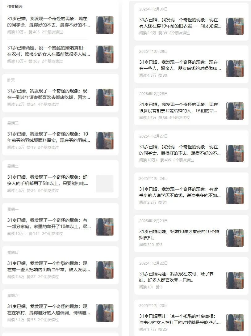 因为账号有人设撑着,只要标题带有”31岁已婚”这段话,就能吸引同频的人点进来。