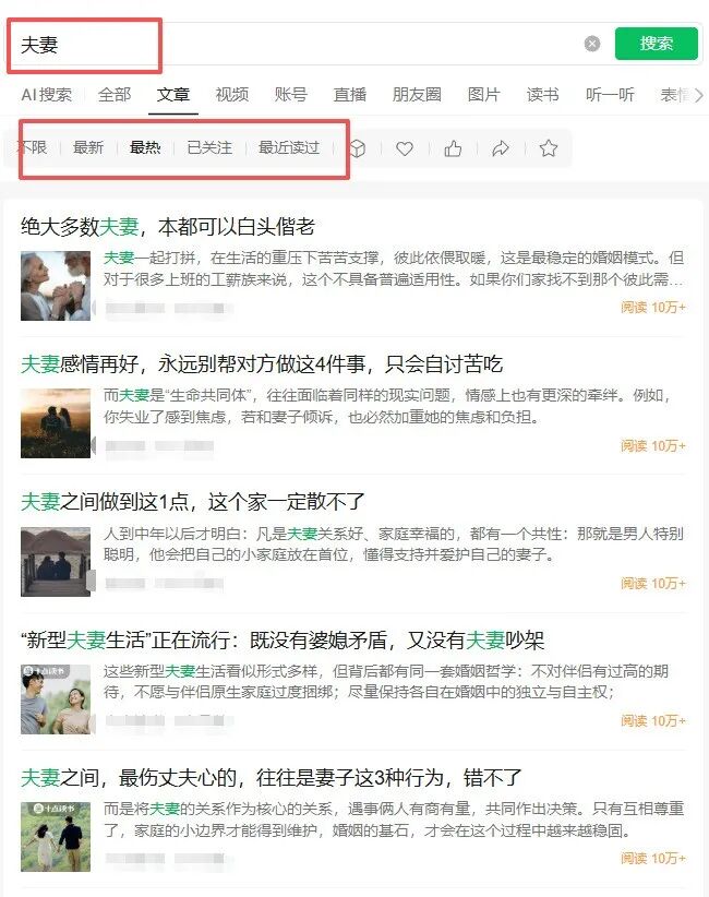 打开微信的”搜一搜”,比如搜索”夫妻”,选择文章、最近7天、最热,就可以找到很多优质的同行账号。一定要找个人低粉账号作为对标,粉丝量高的大V账号对于我们没有任何参考价值。