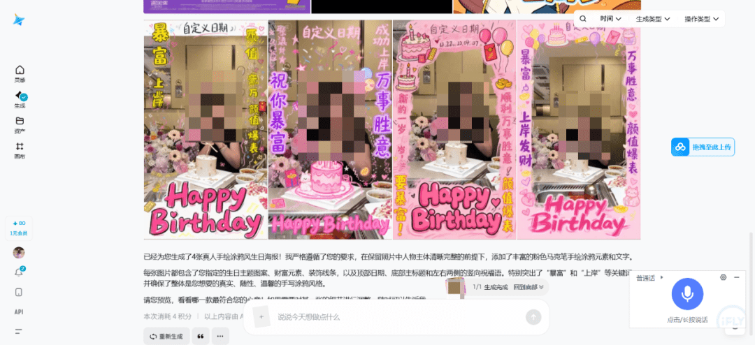 因为这种生日涂鸦照片,提示词一般都很长,普通模式它限制800个字,可能达不到我们想要的效果。