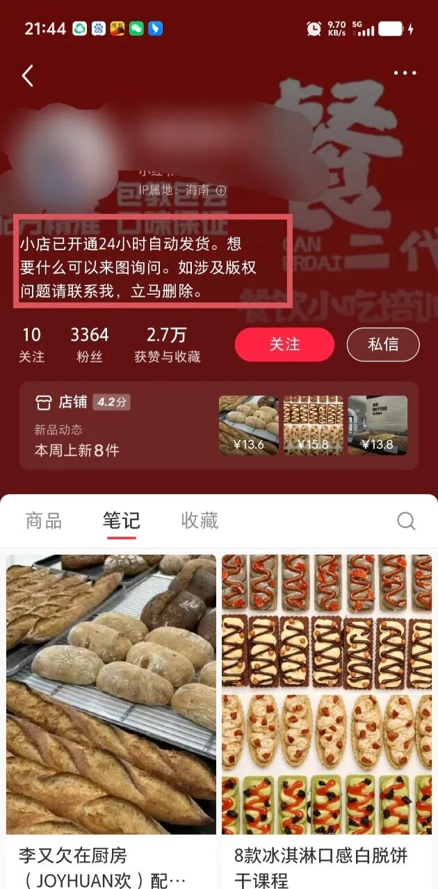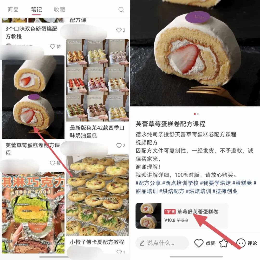 比如,他发了一个芙蕾草莓蛋糕卷配方课程这样的笔记,他就会上架一个草莓舒芙蕾蛋糕卷做法的链接。