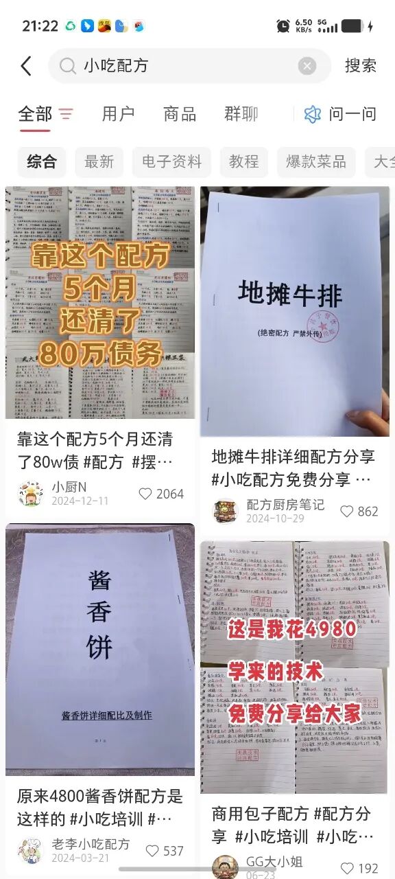 我给你举个最简单的例子,你去小红书搜:小吃配方