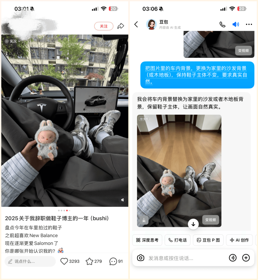 2. 素人晒图:可以去找那种素人的图片,一般有很多分享的AI去重直接用豆包AI即可随便在小红书里找一张鞋子的图片然后打开豆包,上传需要去重的图片输入指令把图片里的车背景,更换为家里的沙发,或者地板,保持鞋子主体不变,要求真实自然,