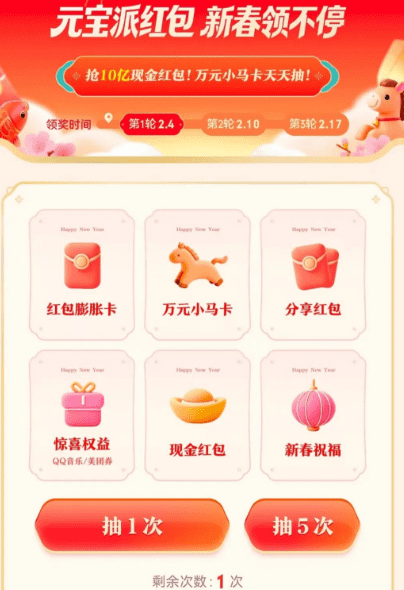 2026 年春节,腾讯元宝直接搞起10 亿现金红包大派送!大家只要抽抽奖、分享红包、顺手完成小任务,就能领到现金,还有机会薅到限量款的万元小马卡。