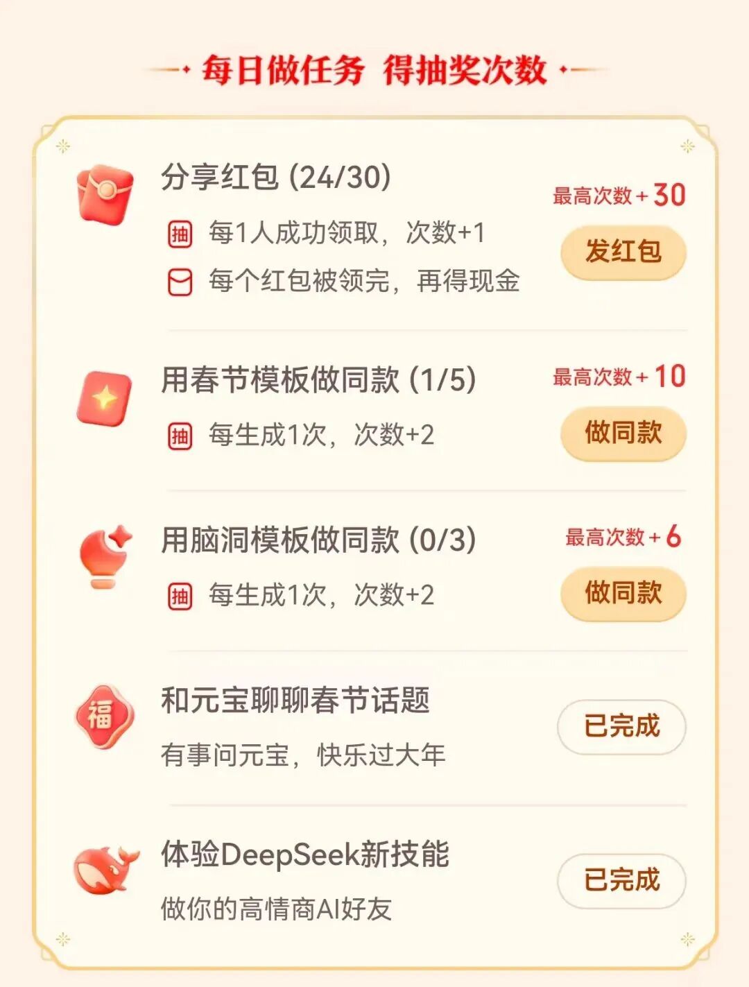 另外,这次还上线了DeepSeek新功能,跟这个AI多聊几句,也能多拿抽奖次数。