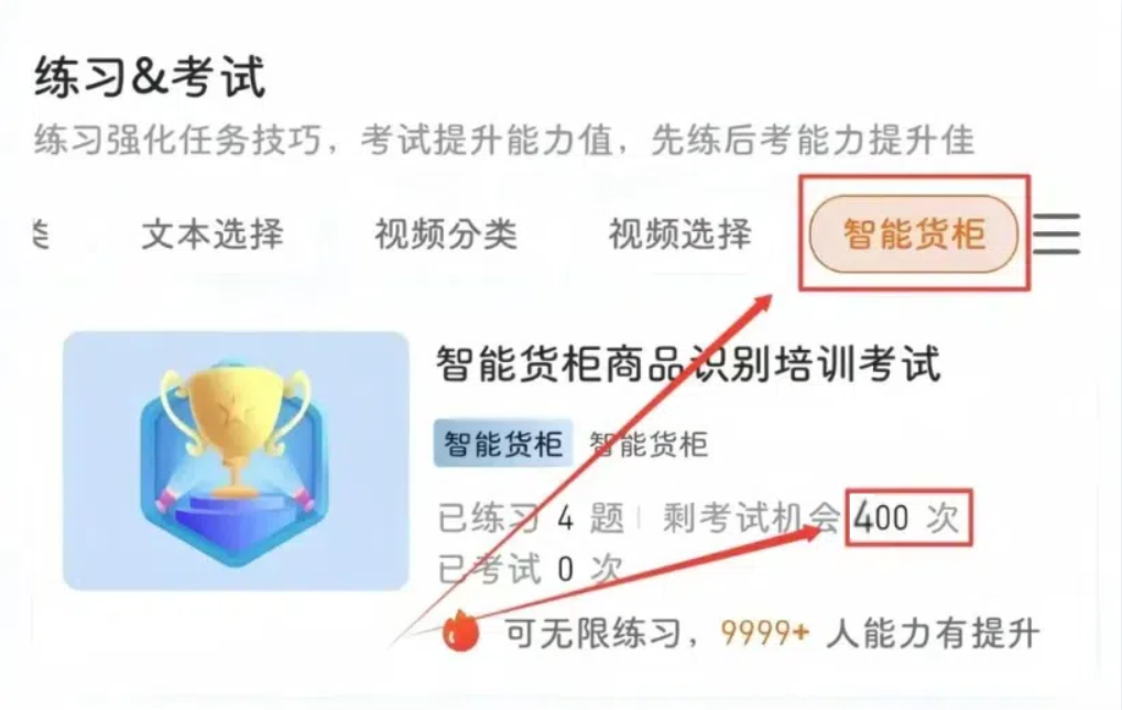 进入APP后,找到智能货柜项目,参加培训并考试。每人有400次考试机会,虽然次数多,但也要认真对待。