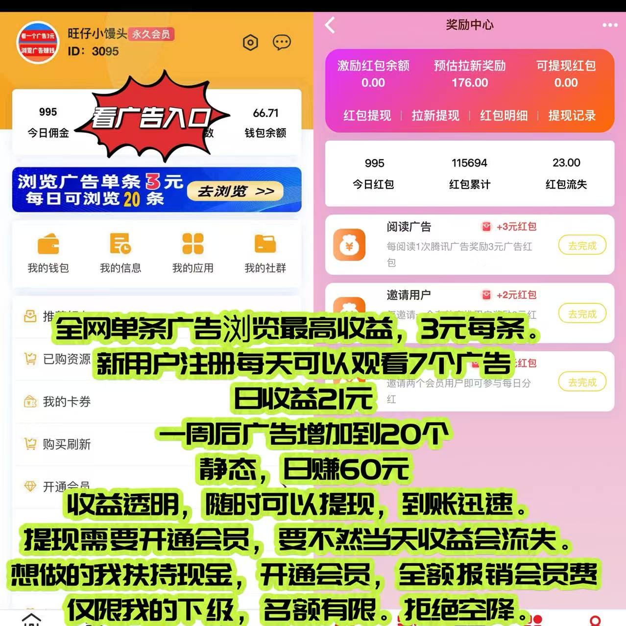 这个平台的亮点在于,每条广告都能带来3元的奖励,而且观看广告后的收益可以即时提现,无需等待,这对于宝妈、学生和上班族来说都是一个不错的选择。