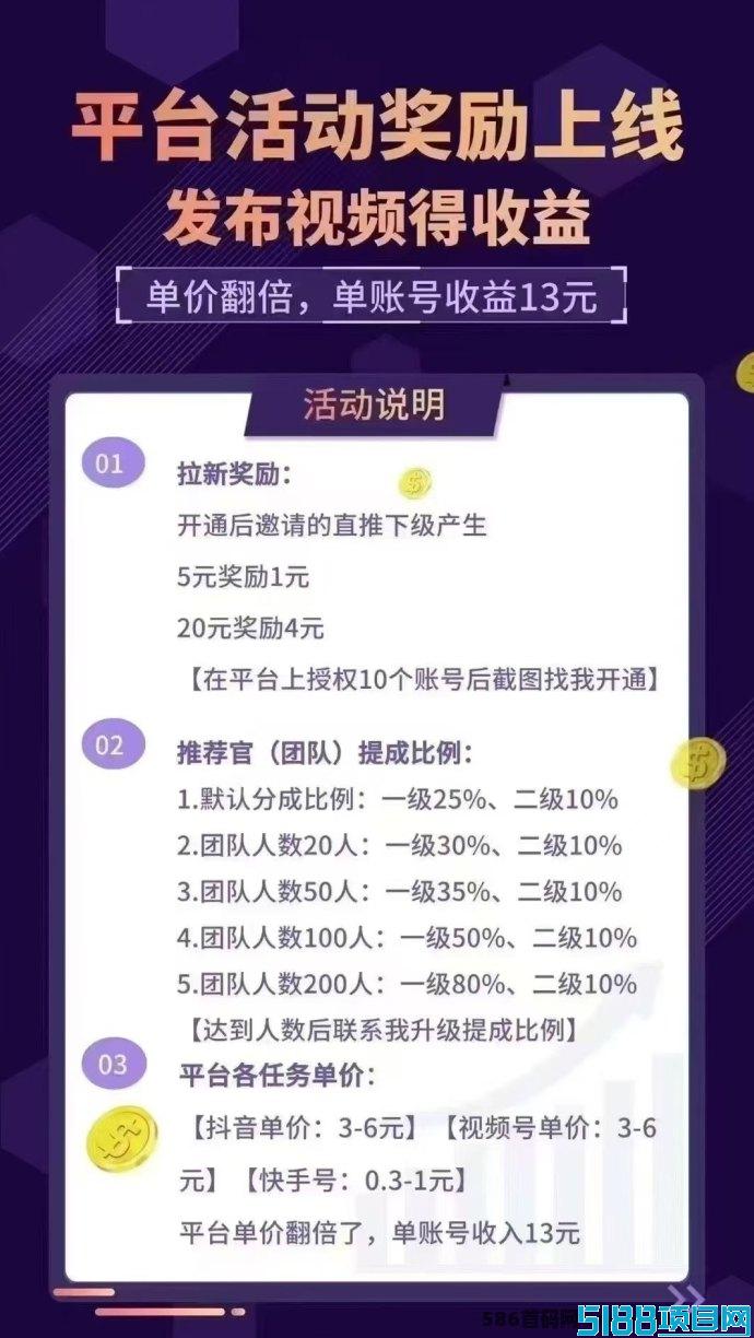 平台不设置播放量、粉丝量或者实铭要求,只要完成任务并发布视频,就能轻松获得收入。这样极大降低了门槛,任何人都能轻松参与,无需担心流量问题。