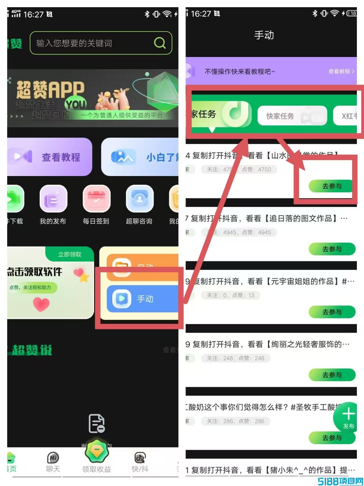 每天手动DY点1赞+1关注,获取600通证,100通证=1米💰【领取软件的时候点手动套餐】