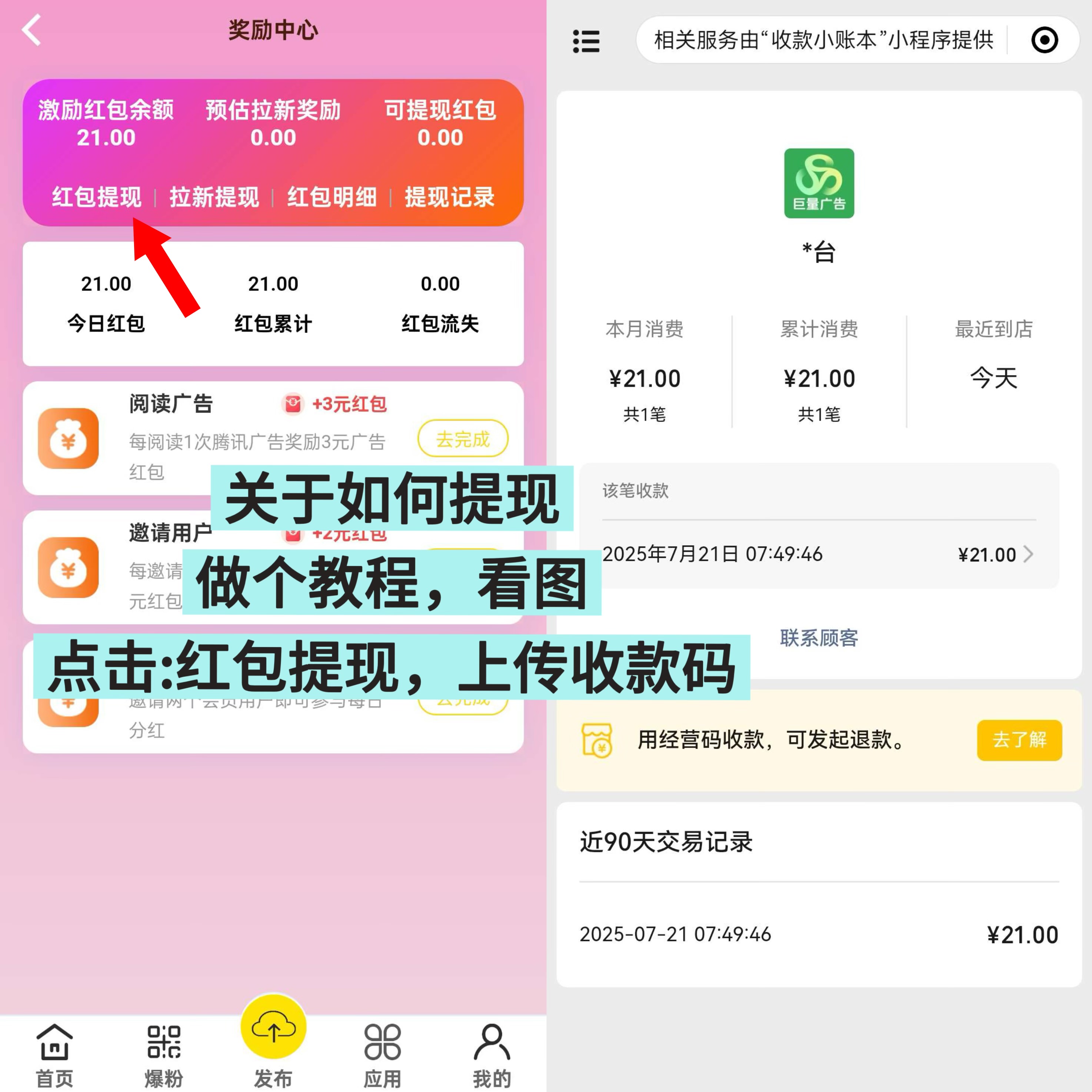 静态收益:新用户注册后每天可以浏览7个广告,每个广告可得3元红包,日赚 21 元。