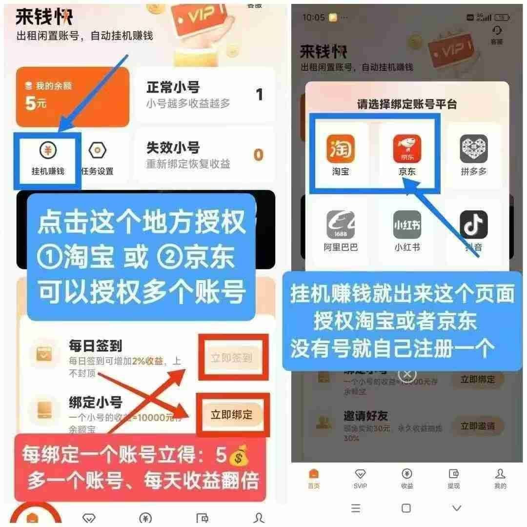 注册绑定挂机账号送5元,直接提米(某宝某东账号授权不是手机号)请注意