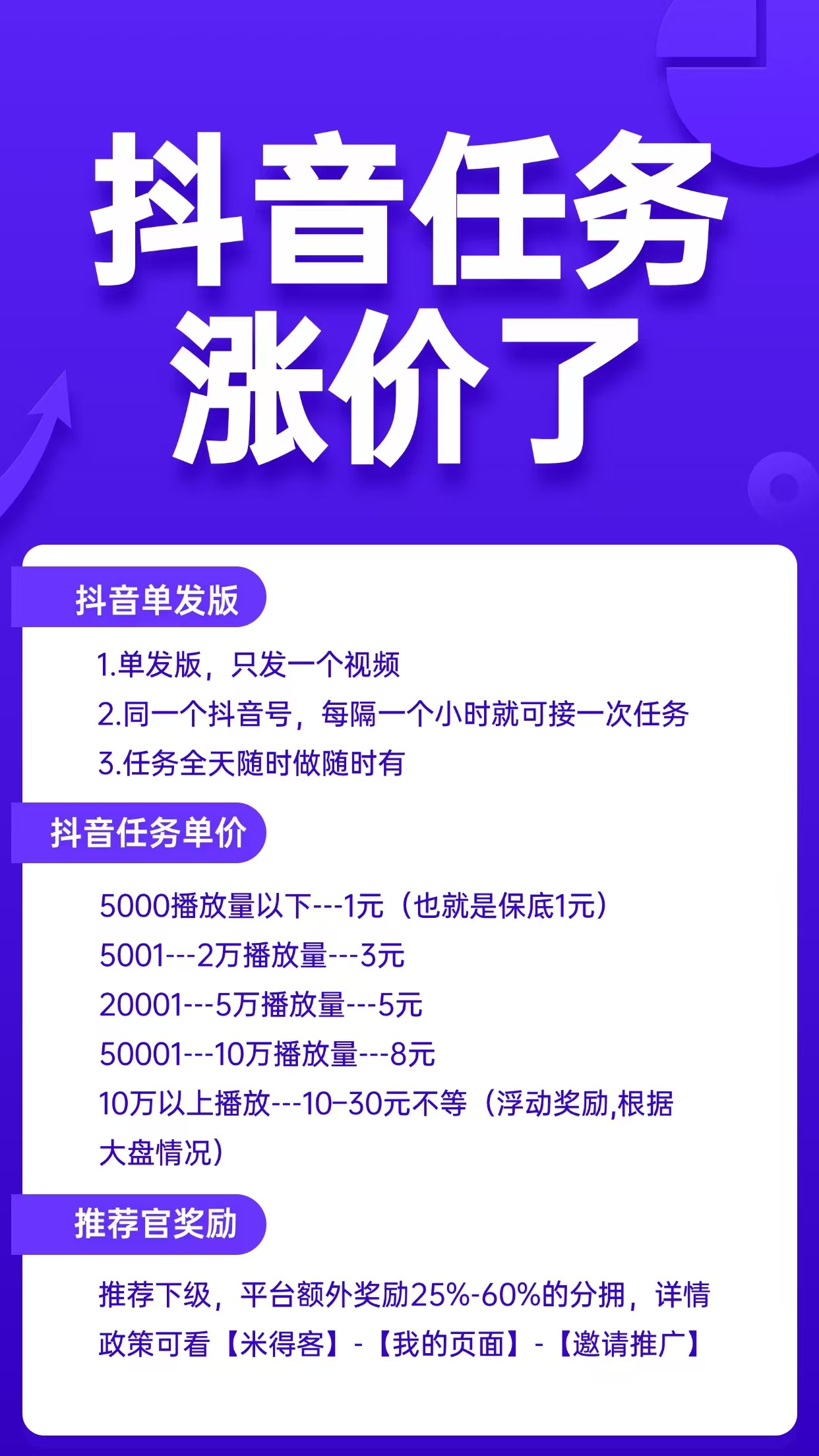 正文 播放量越高,收益越高,每天随时做随时有 首码光明 V评论者 /昨天 /0 评论 /93 阅读 1008 米得客-抖音发视频任务-涨价了同一个抖音号每隔一个小时就可以接一单,播放量越高,收益越高,每天随时做随时有,大家可以做起来了!无需实铭,可绑定多个短视频仗号操作,团队收益(团队80%提成),长久稳定副业,放心做,满10起吱付宝提米,只需要一个抖喑就能一天零撸几十元不香吗?投诉/删帖投诉/删帖