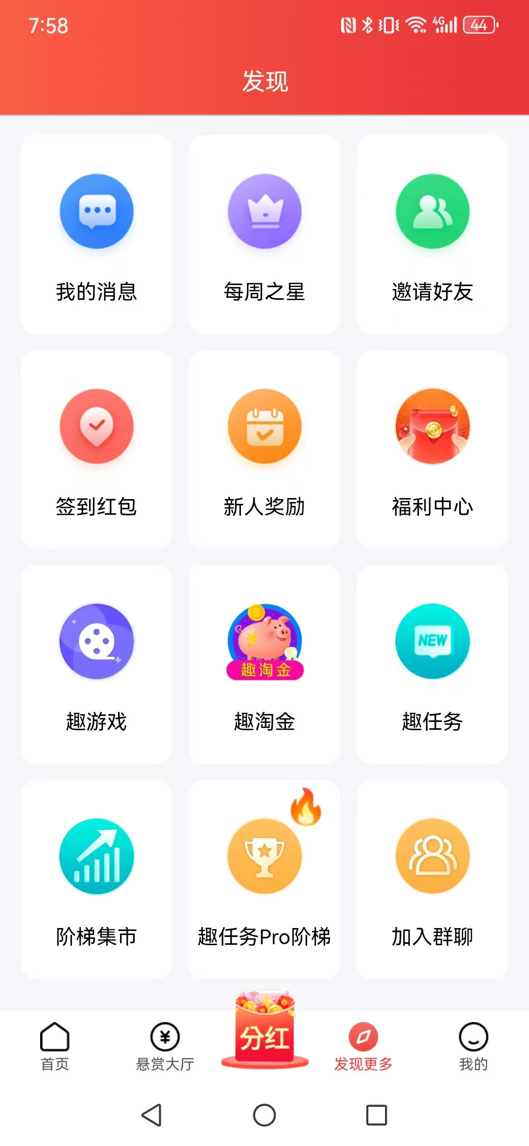 操作方法:点击发现更多[5]—趣任务阶梯参与爬墙—[1]再点新人奖励—领取红包[8]
