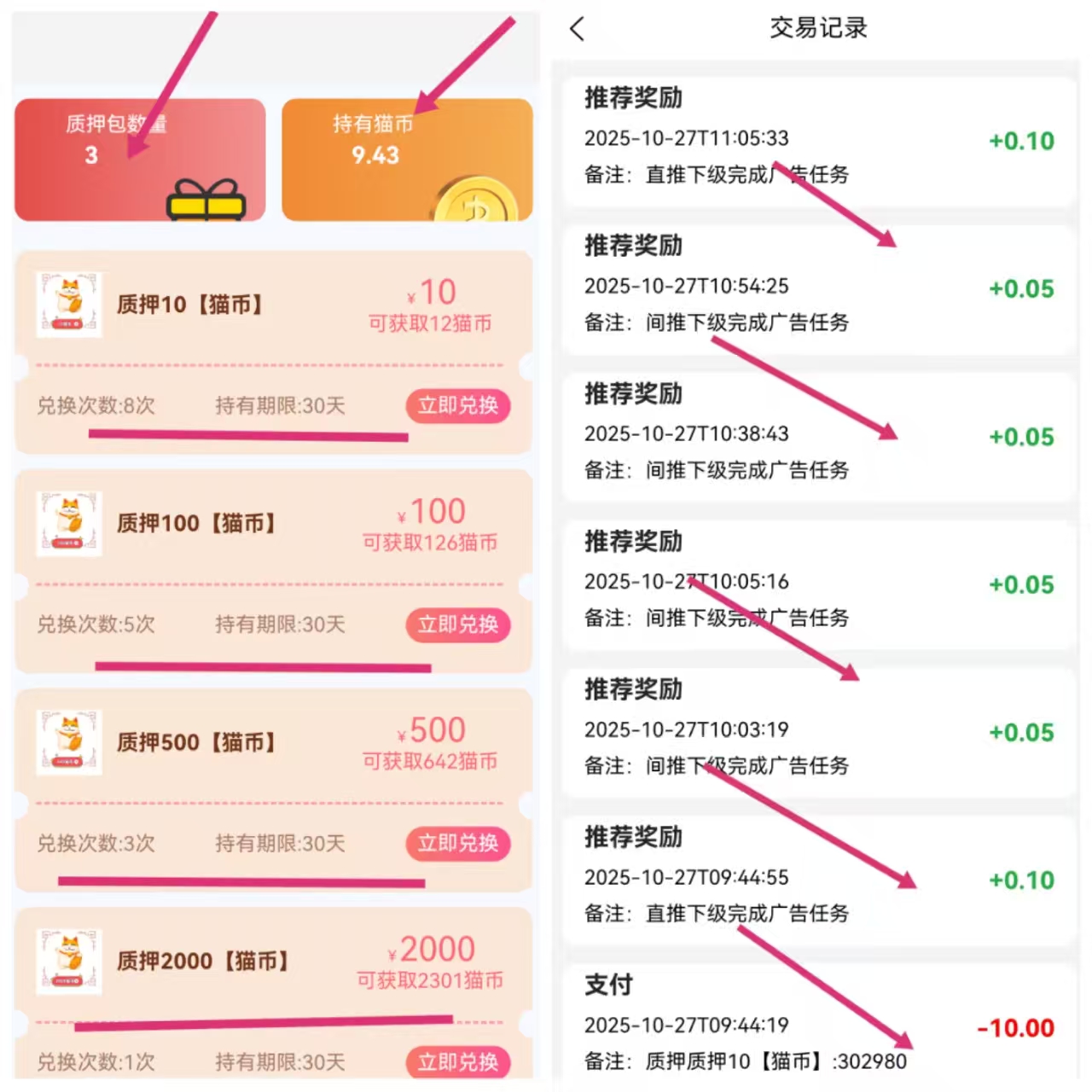 现在普通会员需要质押10猫币成为有效用户才可进行转赠,质押10猫币每天芬虹0.4猫币,观看7条广告每天🉐1猫币=1米,直推好友观看广告收益10%间推用户5%