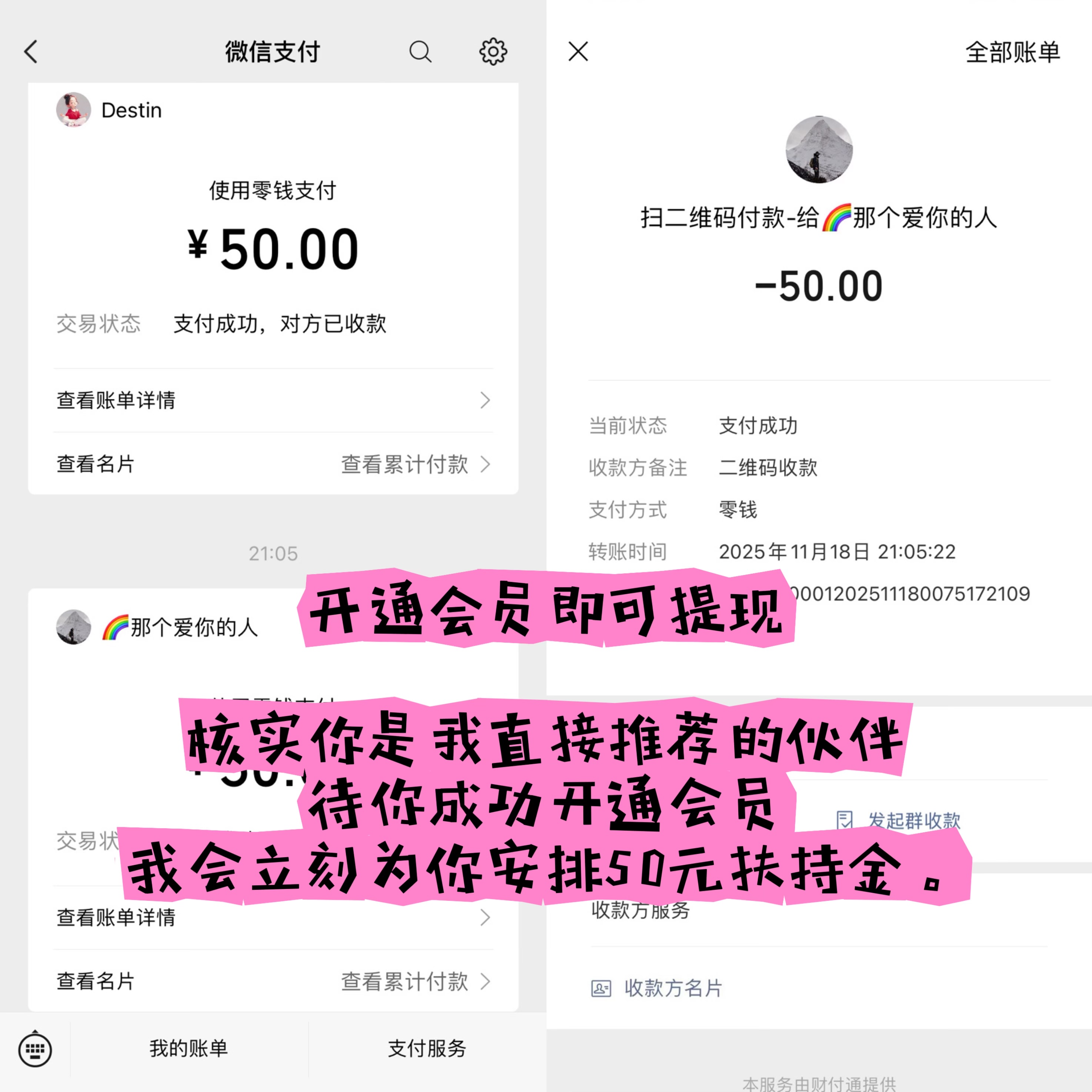 注册完成后,你可以添加我的联系方式,或者在App内私聊我。只要核实你是我直接推荐的伙伴,待你成功开通会员,我会立刻为你安排50元扶持金。
