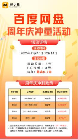 说到底,百度网盘推广的本质不是“拼流量”,而是“拼精准”。用数据思维找到目标人群、用标准化流程打通转化链路、用持续复盘优化策略,再借助“蜂小推”这样的平台实现高效落地,就能告别“流量荒”“转化难”的困境,让推广效果持续增长。毕竟,在互联网运营的世界里,精准才是最高效的“流量密码”。如有问题,请加微信咨询:19355206015。