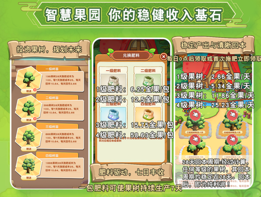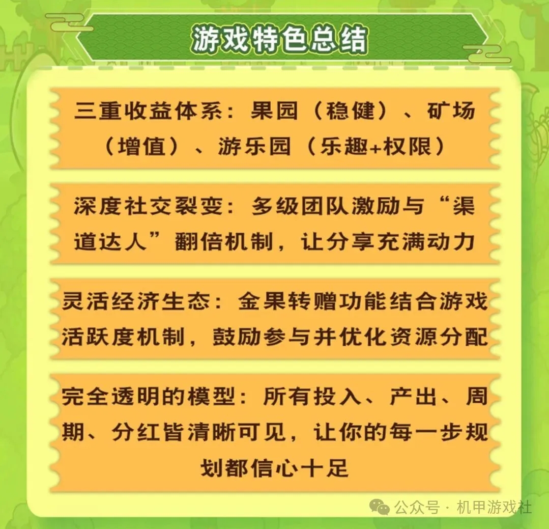 1、三重收益体系:果园(稳健)、菜场(增值)、游乐园(乐趣+权限)