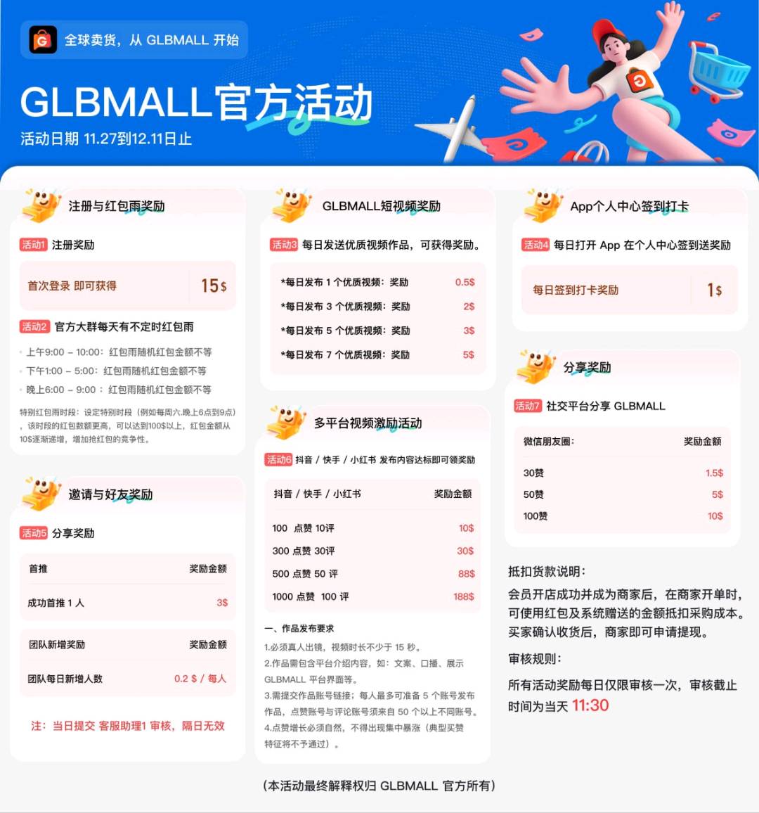 GLBMALL无货源跨境电商平台,主打无货源托管,免费开店坐等出单,另外还有各种小任务可以赚米,让用户轻松参与稳定赚米。注册送15U和签到1U、发作品点赞观看视频奖励等,不断积累,满100r可提现。
