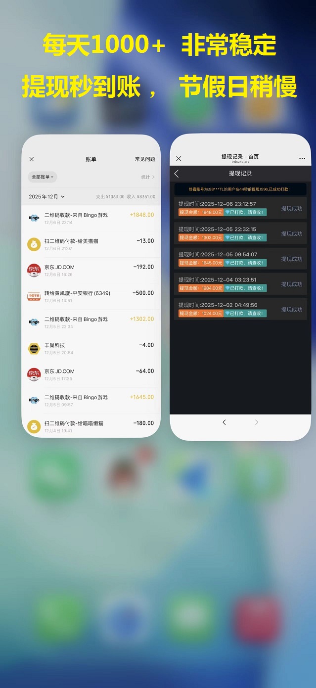 Bingo日赚1000以上 ,看我提现稳定到账截图,收益暴力 !