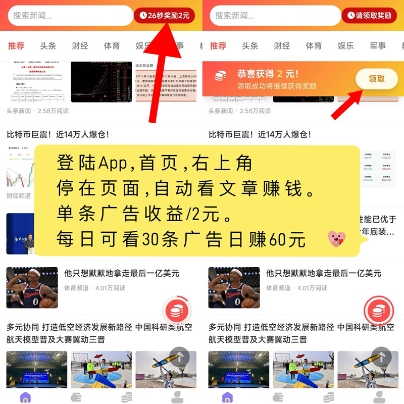 每条广告30秒,支持自[文]动播放,无需手动干预,[章]看完点"领取"即可得2元/条。每日可[来]刷30次,单日封顶60[自]元,完美利用碎片时间。[5]