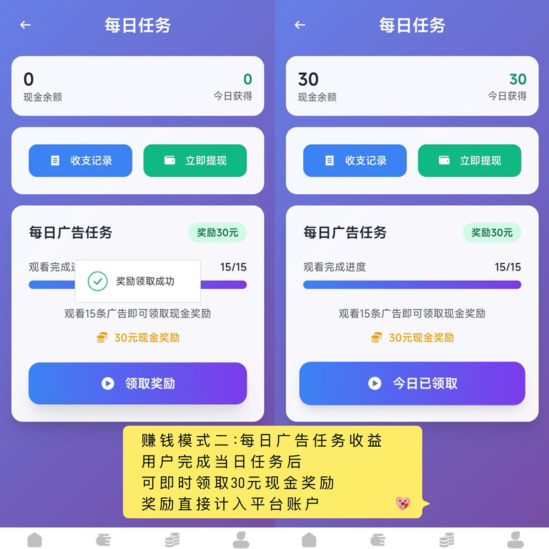 每日完成15条有效广告[1]观看,立得30元现金。[8]任务可分时完成,进度自[8]动记录,防止重复操作,[项]兼顾收益效率与灵活性。[目]