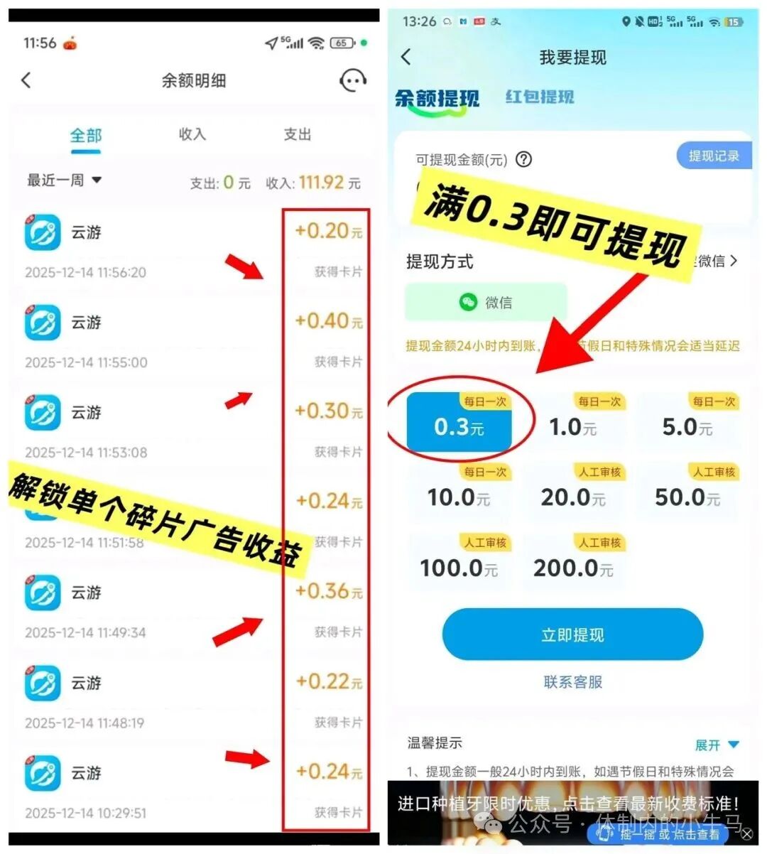 现在这个平台刚出首码每个包都是0.2-0.4元且满0.3即可提现都是秒到。看完一轮(大概20多个广告)可得20-80元。