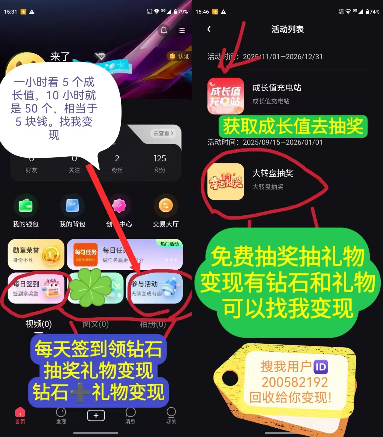 ⑤包回收钻石和成长值,给你变现,自己推人的动态奖励去钱包里提现就行!