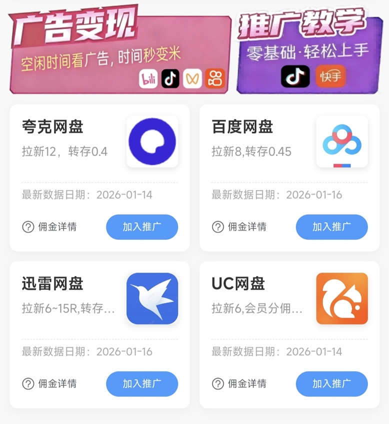夸推班网盘拉新推广,人人可做,单机高结算快,夸推班这个平台是一个做网盘拉新推广的平台,夸推班目前上线了五六个网盘,免费注册就可以申请开通推广权限,结算周期也是比较短的一个平台,单价行业置顶价格。