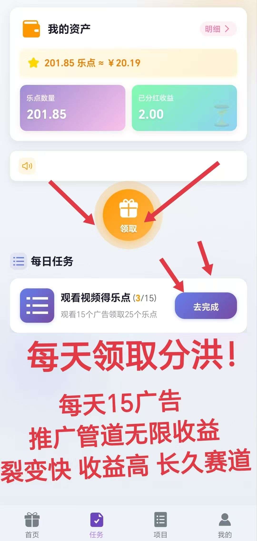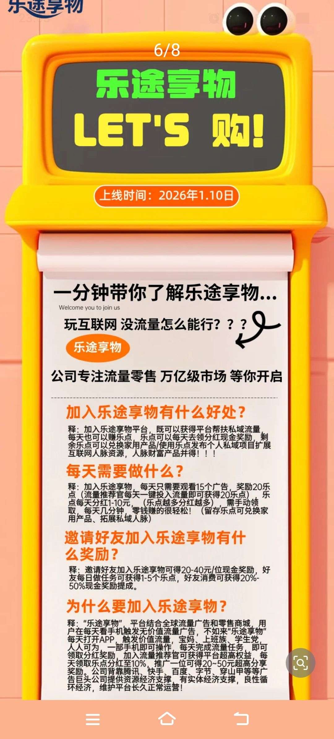 乐途享物,项目引流+零[文]撸广告赚,保底收益高,[章]不养机,拉新奖励,邀请[来]日入百米。