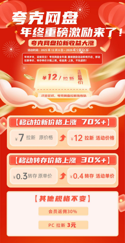 夸克网盘这次的激励,从去年12月一直开到今年1月底,这时候参与推广,收益比平时高不少,移动端拉新从7块涨到12块,转存从3毛涨到4毛,PC端拉新也有3块,消费分成直接给到30%——这数字一摆出来,谁不心动?但心动归心动,真要下手,得先摸清楚门道,不然钱没赚到,还惹一身麻烦。