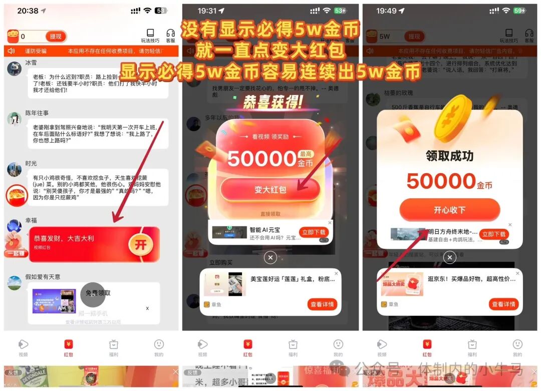 进入平台直接点红包看广告就行,没有显示必得5w金币就不领取,到5w金币再领取。放水补贴,水特别大,满1米起提 秒到账!