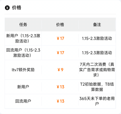 回流用户(365天及以上未在淘宝下单的老用户)推广成功同样可获17元/单;若推广用户在7天内产生二次消费(含真实广告需求点击或购物消费),可再得9元/单;
