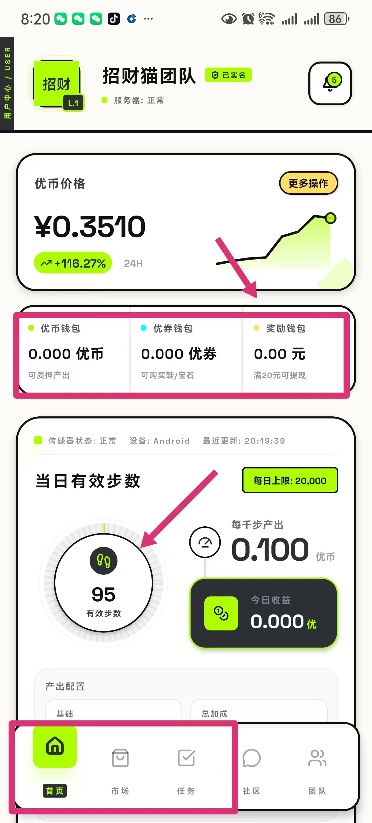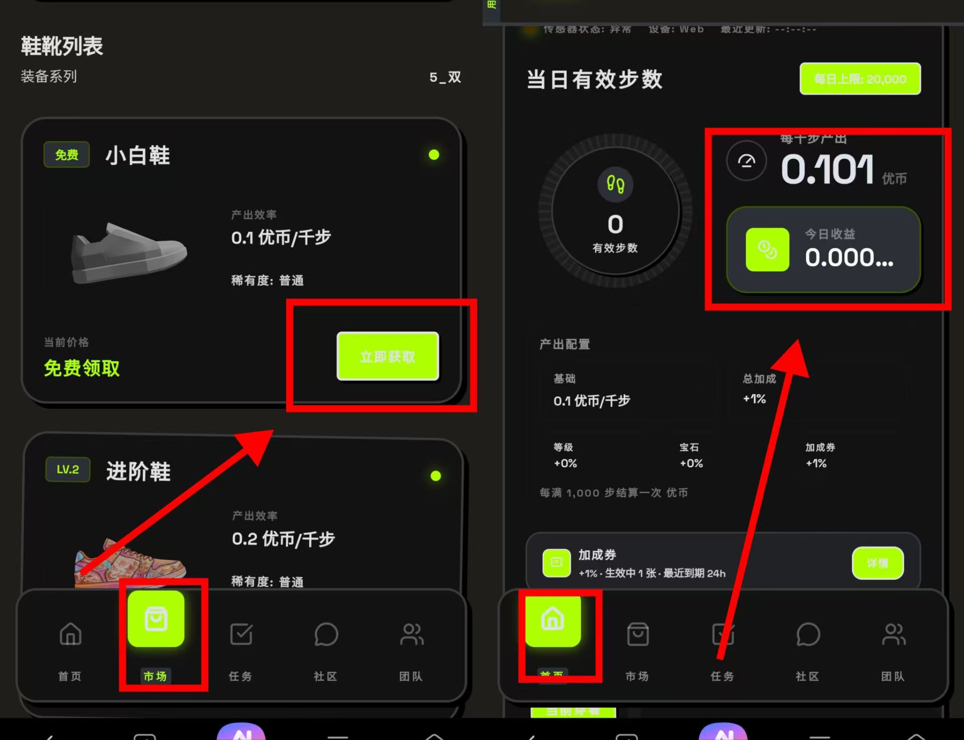 🚀 优券升级你的赚钱效率:使用优券可在商城兑换 高端运动鞋和配件。装备升级后,你的每日步数将享有额外收益加成,让你走得更值、赚得更快!