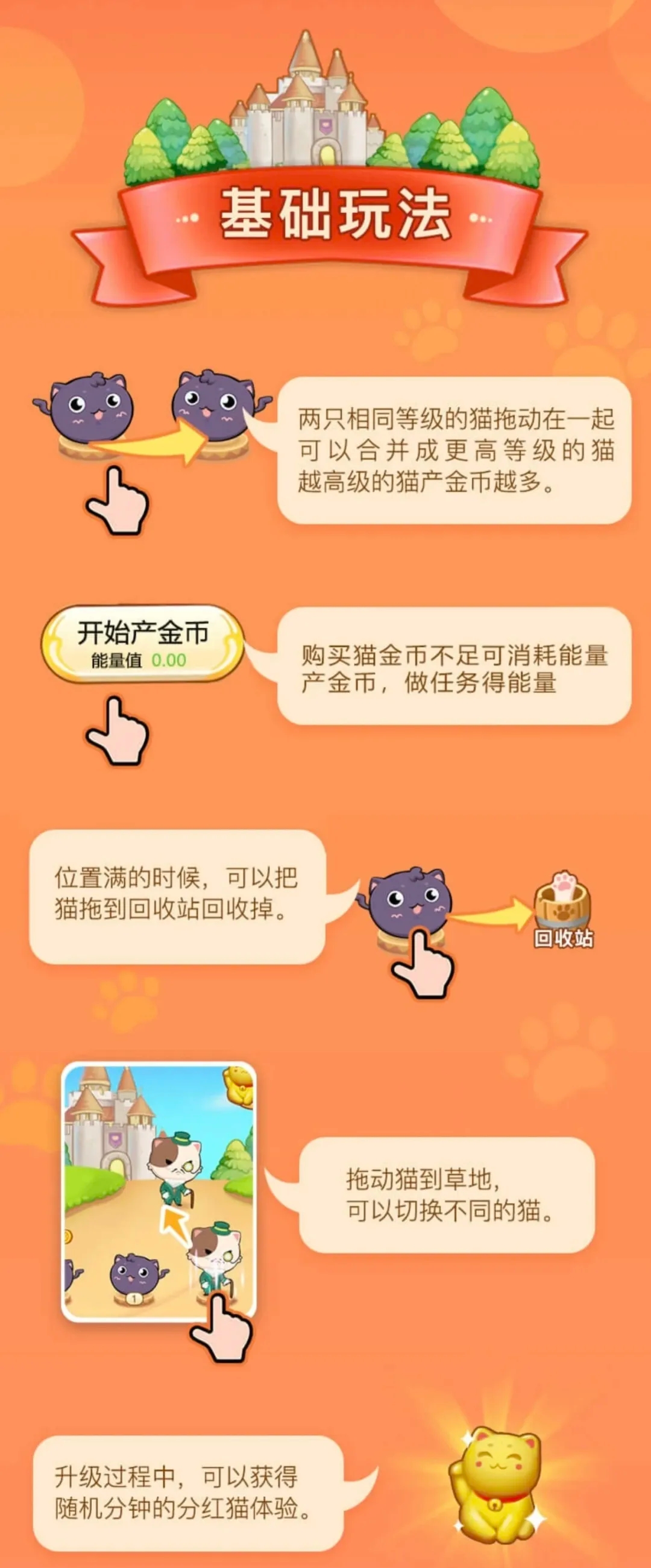 在核心玩法上,项目以猫[5]咪合成为核心,每完成一[1]次同级猫咪合成升级,都[8]能直接领取红包奖励,猫[8]咪等级越高,产的金币也[项]就越多,并且在猫咪合成[目]38级以后,直接获取永[网]久招财猫,解锁长期分红[文]资格。