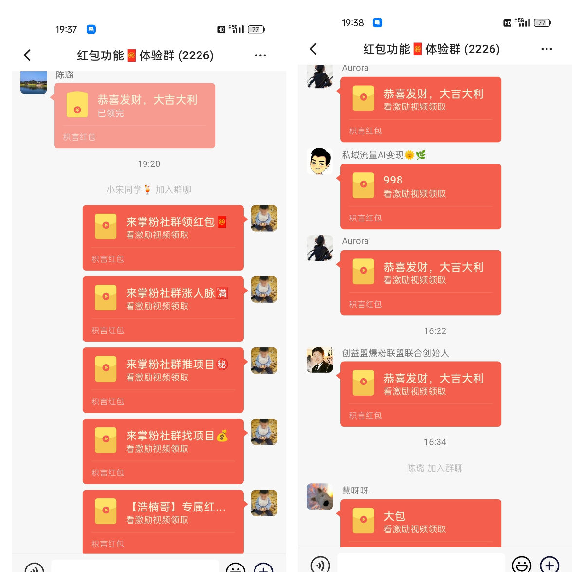 掌粉社群新增红包玩法,每人每天可以发50个红包,成本0.01元/个,红包被领完后,你就可以获得他们领取金额的总和(一般都是10倍左右)
