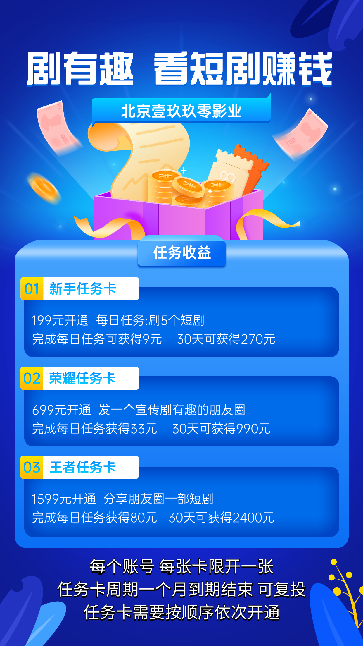 自剧有引力成功后,很多人开始对这个项目期望很大,北京壹玖玖影业发起制作,预计5月23日开始,通过充值剧币,1元1个,解锁任务卡购买短剧使用,199剧币刷5个短剧每日得9个剧币,还有其它高等级任务,APP上线2周后每周上新3-4部短剧认购,每周结一次,3-50%浮动。