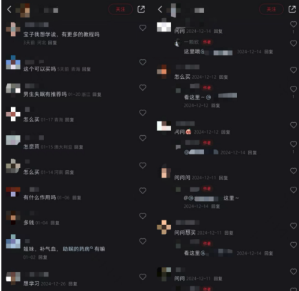再看上面这两篇笔记的评论区,几乎全是询问购买方式的留言,如图所示。然而用户对中药手串产生兴趣,并不一定就会在你的小红书店铺下单购买。实际上若想实现更好的销售业绩,应当将这些有购买意向的用户引流至微信,在微信上进行销售更为适宜。因为添加微信后,不仅能显著提升转化率,还能促进用户的重复购买。只是他们在添加微信后具体达成了多少销量,由于属于私域数据,我们无从查证。但可以肯定的是,店铺销售都能达到几十万,引流到微信后的销量必然远超店铺数据。