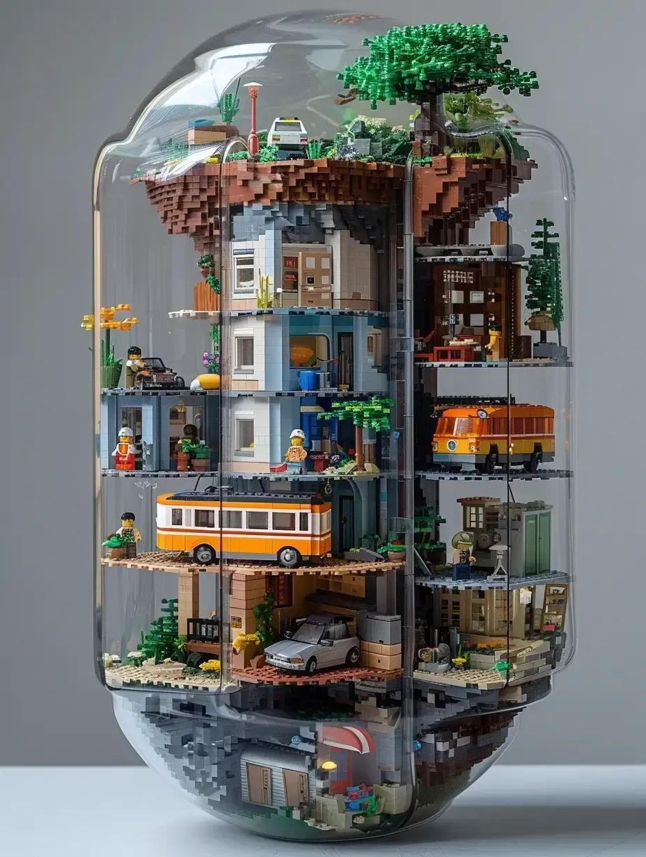 4、用乐高积木搭建一个多层垂直场景,场景被透明外壳包裹。每一层分别设置不同主题,如底层是带有红色车辆和绿植装饰的车库场景,有乐高小人活动;往上一层是棕色房屋搭配黄色巴士的街区场景,房屋有门窗细节;再往上有橙色有轨电车穿梭,周边布置绿植和乐高小人;顶层是带有树木植被的户外场景,有几辆不同颜色的乐高车辆停放,整体场景细节丰富,色彩鲜明,具有故事感,呈现出乐高积木特有的颗粒感和拼搭质感。
