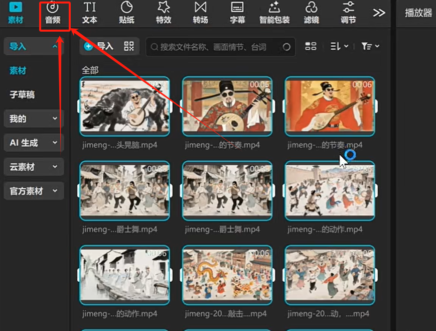 后面的视频也是以此类推,全部生成。生成的视频如果有水印,可以点击下面的蓝色字体免费去水印帮你每月省下79元,即梦AI无水印下载图片视频的方法4. 视频合成打开剪映,先将视频全部导入主轨道,同时添加背景音乐【陕北摇】可以去抖音搜一下这个音乐的相关视频,然后复制链接打开剪映的音频选项,导入链接,这样背景音乐就直接添加进来了。