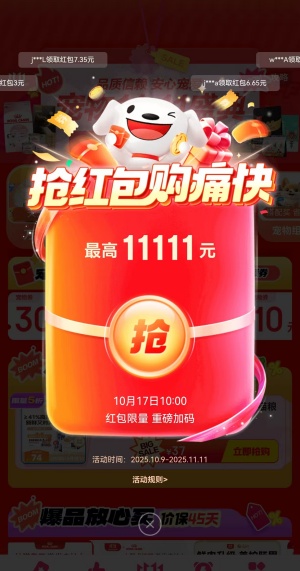 2025年京东双11超级红包活动来了,每天都可以去,这个活动是必中的,打开微信或者京东APP进去活动里,每天进去都会必中一个随机金额的京东超级红包,在红包首发当日、以及红包加码日还有概率领到大额红包,红包金额最高11111元,累积得到的红包可以在京东购买任意实物商品无门槛抵扣使用,这段时间每天都可以去领,这个活动是必中的。
