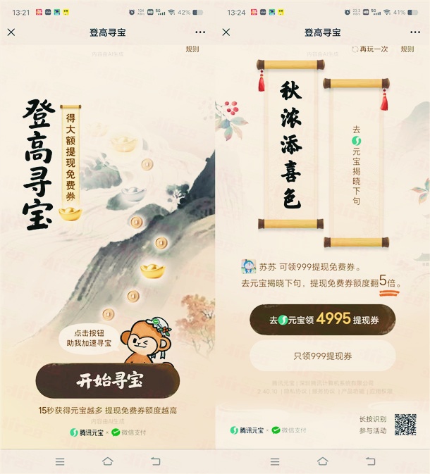 正文 微信登高寻宝小游戏领微信免费提现券 5188 V管理员 /昨天 /351 阅读 1028 温馨提示:文章均来自网络用户自主投稿,风险性未知,涉及注册投资需谨慎,因此造成损失本站概不负责! 微信登高寻宝小游戏领免费提现券活动,打开微信进去活动里,完成简单的小游戏,可以领到最少几千微信免费提现券(需要去腾讯元宝领),如果不满意分数可以反复玩,提现券可以用于微信提现的时候免手续费。微信扫下面码进入活动:活动时间:结束日期未知进入活动页面完成简单的小游戏,可以领到最少几千微信免费提现券(需要去腾讯元宝领),如果不满意分数可以反复玩,提现券可以用于微信提现的时候免手续费。投诉/删帖