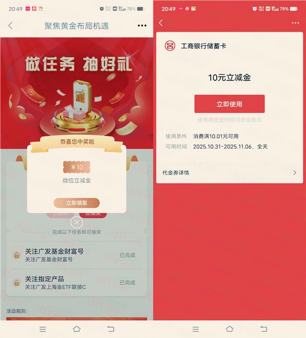 正文 工商银行广发基金简单任务,抽10-88元微信立减金 5188 V管理员 /今天 /271 阅读 1101 温馨提示:文章均来自网络用户自主投稿,风险性未知,涉及注册投资需谨慎,因此造成损失本站概不负责! 工行举办的广发基金简单做任务抽好礼活动,打开中国工商银行APP进去活动里,完成2个简单的关注任务就可以抽奖2次(如果之前关注过就取消重新关注),有机会中到10-88元微信立减金,小编亲测中到10元秒到,非必中。微信扫下面码进入活动:活动时间:即日起至2025年10月31日微信扫码跳转到“中国工商银行”APP,完成2个简单的关注任务抽,2次机会,非必中。投诉/删帖